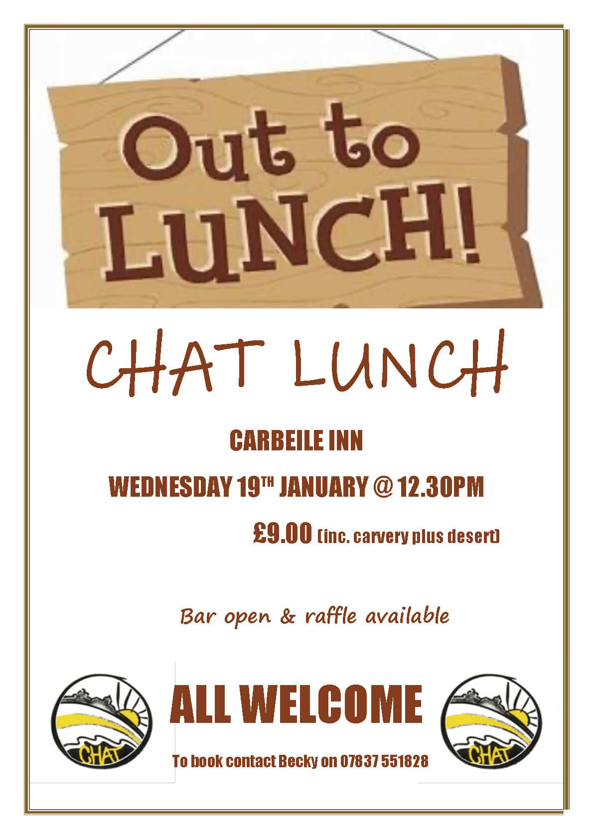All welcome at the CHAT lunch at the Carbeile Inn, Torpoint on Wedneday19th January 2022. Contact Becky…